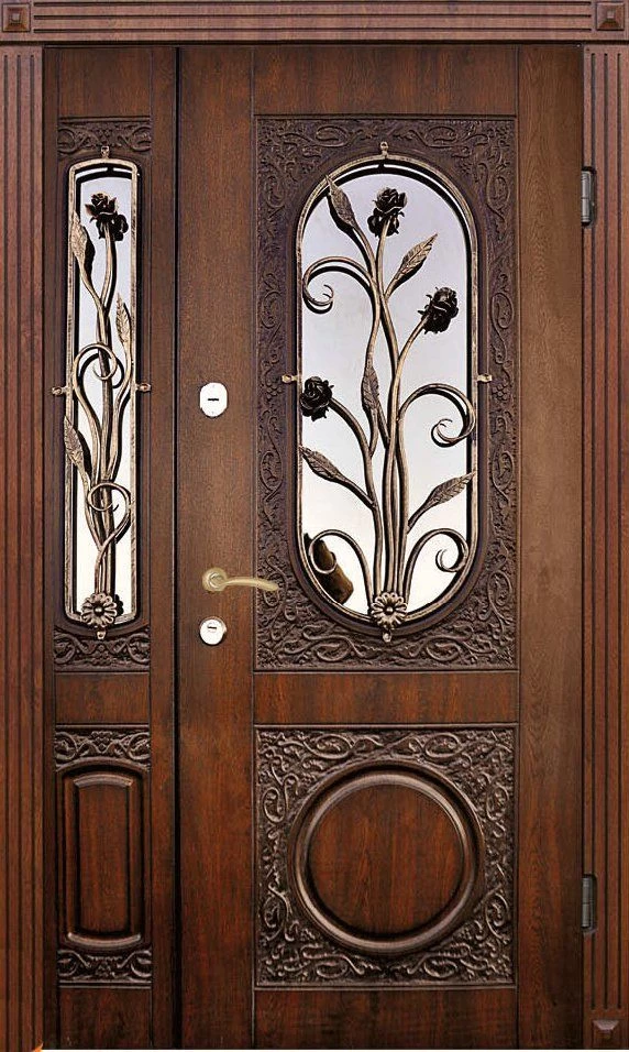 Поскольку в большинстве случаев устанавливаемые на входе в коттедж двустворчатые двери являются еще и предметом интерьера, украшающим здание, их дизайну предается особое значение. Эти двери, как правило, отделываются атмосферостойким МДФ, натуральным шпоном, массивом. Эффектно на таких дверях смотрится витражный узор, применение ковки, зеркальных элементов. Вариантов декора входной двустворчатой двери масса, тут все зависит от пожеланий заказчика.